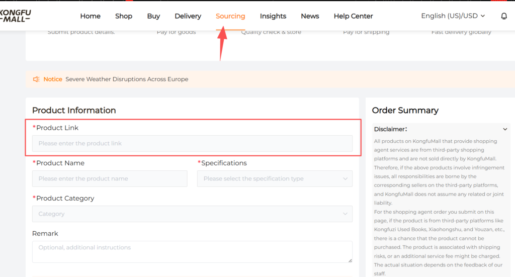 KongfuMall's public help content specifically identifies Sourcing as the route for platforms like JD and Pinduoduo. That makes it a natural solution when a buyer already has the product link and wants the platform to take over the procurement flow. In that use case, the buyer fills in the required product information, submits the request, and lets KongfuMall handle the sourcing and purchase side.