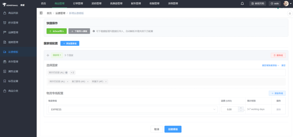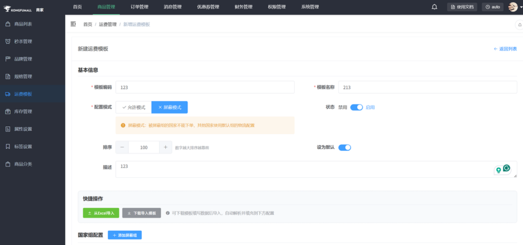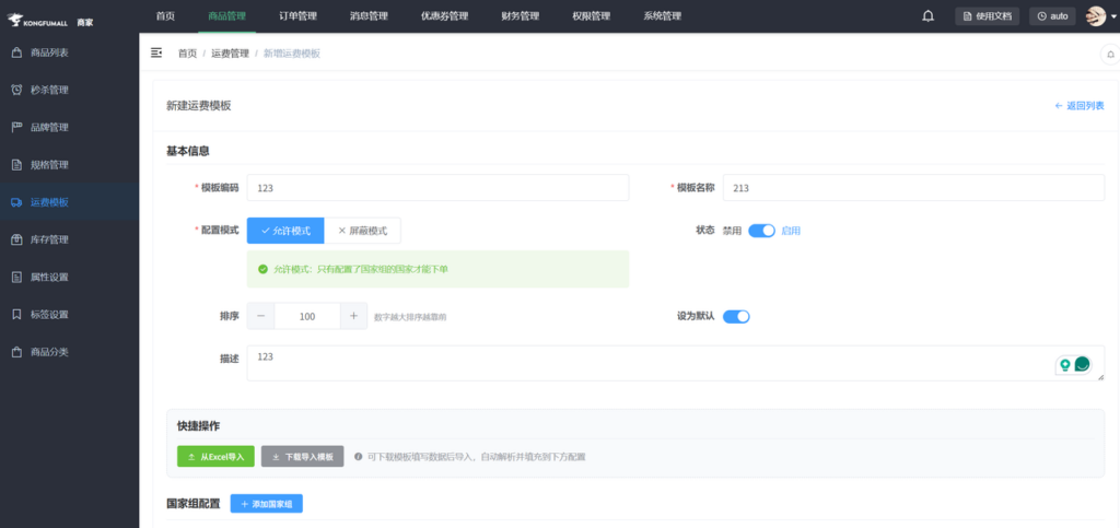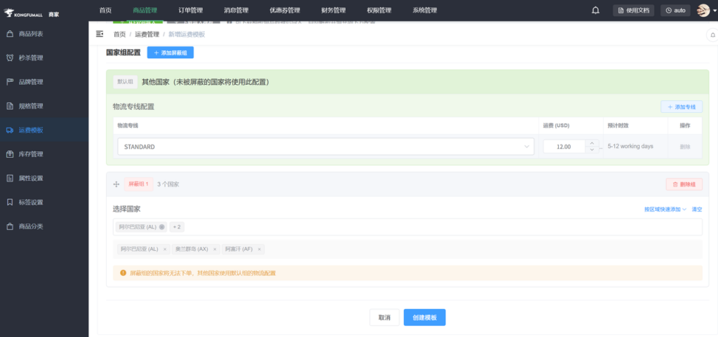 Allow Mode: Only countries configured within a country group can place orders. Add country groups below and select countries permitted to use this shipping template. Then configure dedicated logistics routes. When users place orders, countries in the allowed country group will automatically select the dedicated logistics routes configured for the Allow Mode.