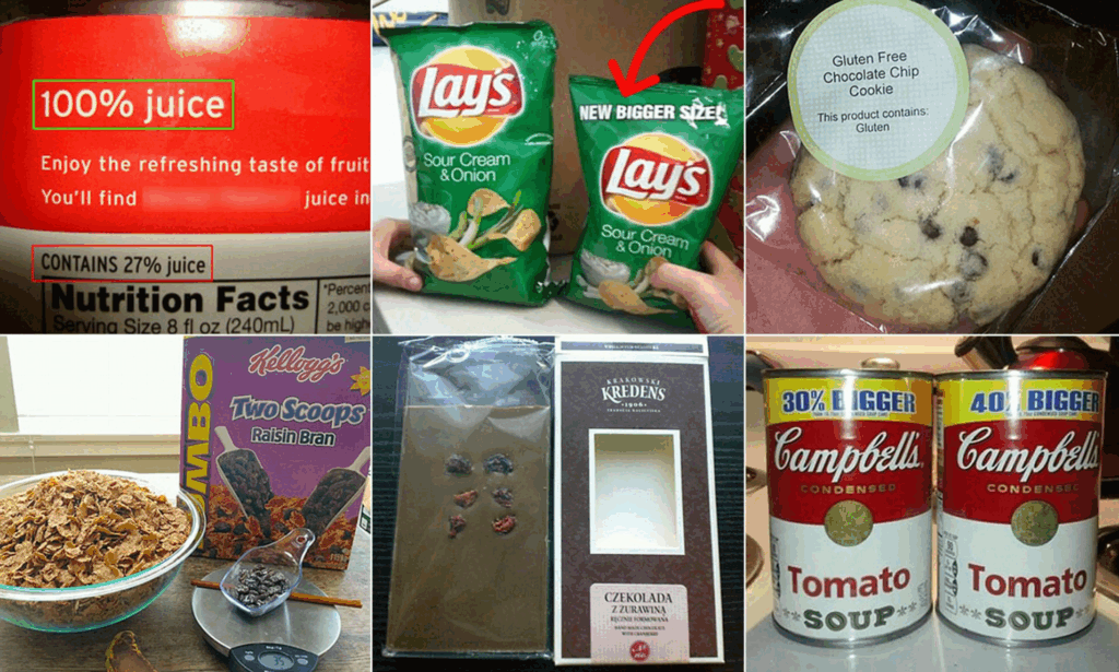 A buyer relied on front-label claims instead of checking the fine print. One product claimed "100% juice" on the front, but clearly stated "contains 27% juice" in the nutrition panel. Another item was labeled "Gluten Free," while the ingredients list openly included gluten. A snack bag advertised "New Bigger Size," yet the package was nearly identical to the old version. In another case, the packaging showed a whole chocolate bar, but inside was only a thin wrapper with a few pieces.
